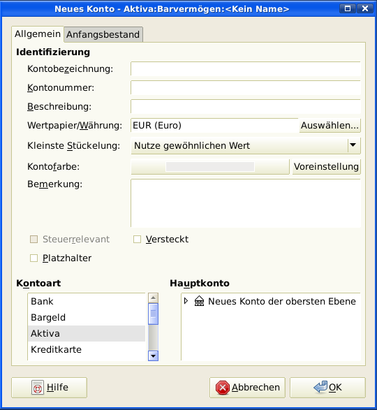 Kontobezeichnung Aktiva (Kontoart Aktiva, Hauptkonto Neues Konto der obersten Ebene)