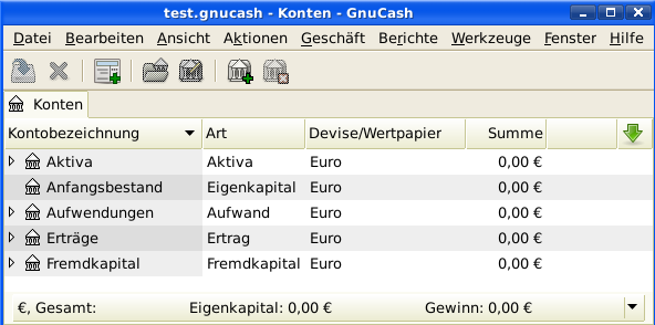 Nachdem Sie die Konten der obersten Ebene angelegt haben, sollte die Konto-Seite in GnuCash